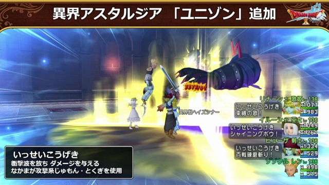 例えば画像のように「自キャラ・ヒューザ・イルーシャ・リナーシェ」という構成で挑んだ場合に「いっせいこうげき」を使うと