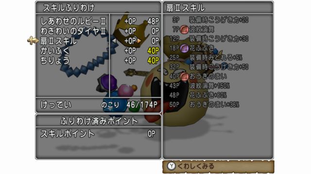 使わないスキル覚えさせたくなかったのでスキル振ってませんけど、わざわいのダイヤと扇IIスキルには「みかわし+」と「みとれる+」があるので振る価値はありますね。