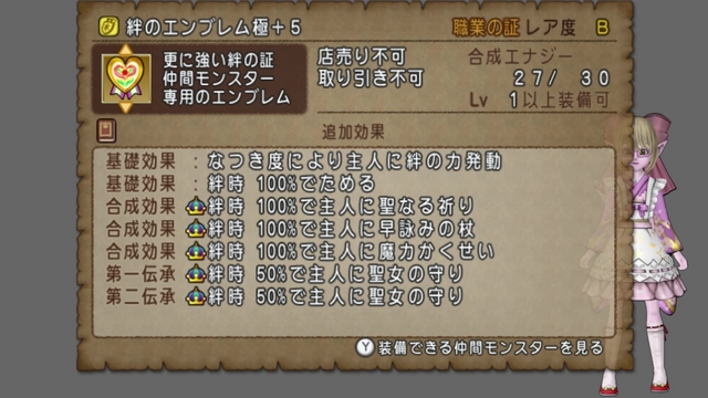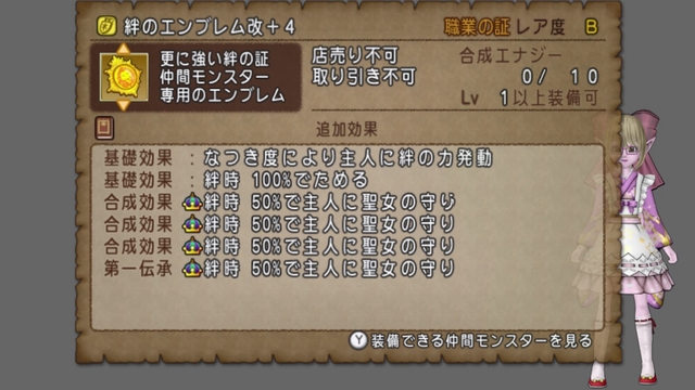 絆のエンブレム改を「絆時 50%で主人に聖女の守り」の埋め尽くしで作り直してから伝承させました。