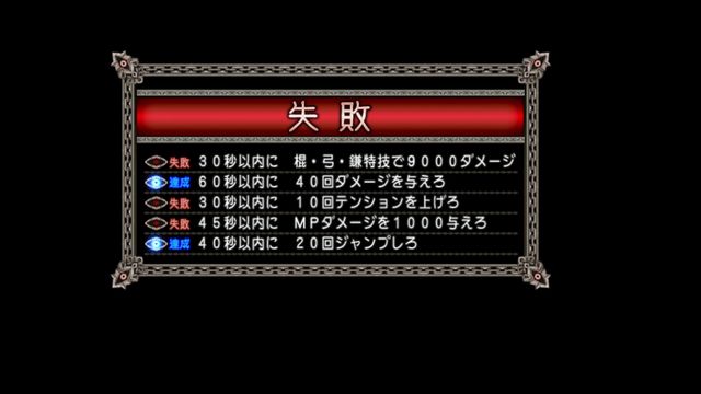 | ・ 30秒以内に 棍・弓・鎌特技で9000ダメージ |
