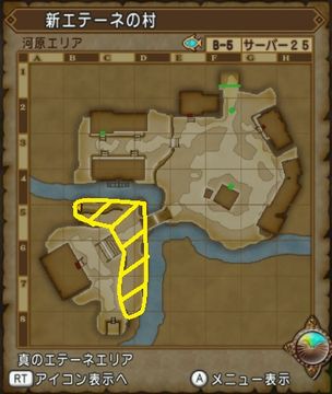 新エテーネの村の黄色の部分が河原エリアです。