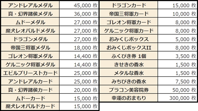 今回の景品の中で、1回限りの青文字のものを除外した繰り返し受け取り可能なものはこちら。