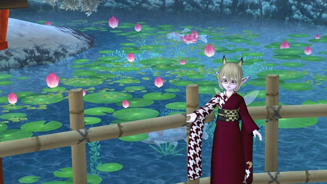 まだつぼみの睡蓮が咲き、池には黄金の鯉や亀が現れます。