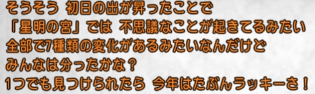来年も初日の出が昇ったあとドラキーが「星明の宮で7種類の変化がある」というアナウンスをするとおもいます。