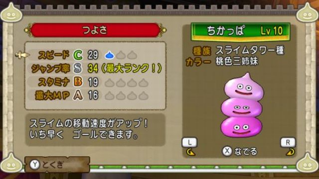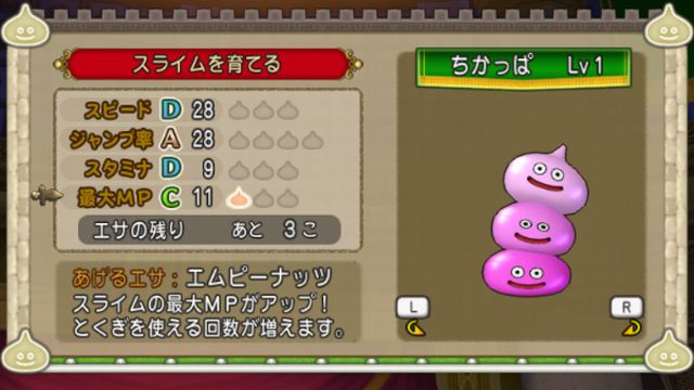 急速回復があるとはいってもスタミナはB以上欲しいし、ジャンプ伸ばさないならスライムタワー選んだ意味がないなとか考えてたらこんな感じ。