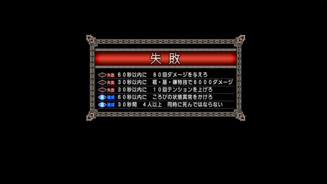 | ・ 30秒以内に 棍・扇・鎌特技で8000ダメージ |