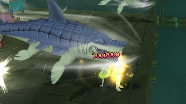 イカダ横のしぶきからサメバーンが飛び出してきます。