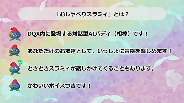 また、スラミィの知識はアストルティアの中に限られるそうで、現実世界の話題には「何のこと?」と返すそうです。