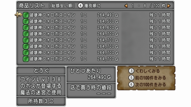 一方フォロボスコインは26万ゴールド台前半と1等でありながら、2等のデスマシーンコインより安いという逆転現象が起きています。