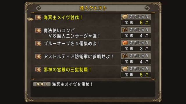 今週宝珠が5個もらえるのは、海冥主メイヴ討伐!邪神の宮殿三獄制覇!の2つ。