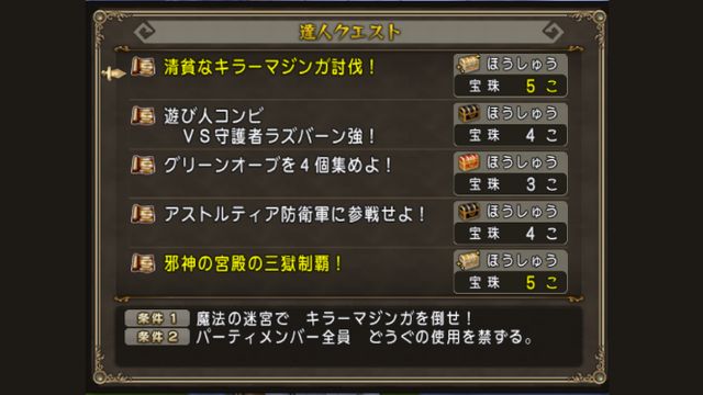 今週宝珠5個なのは、清貧なキラーマジンガ討伐!、邪神の宮殿の三獄制覇!のふたつになります。