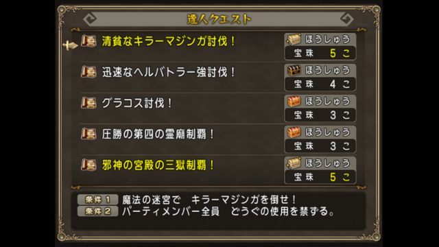 今週宝珠5個なのは、清貧なキラーマジンガ討伐!と邪神の宮殿三獄制覇!になってます。