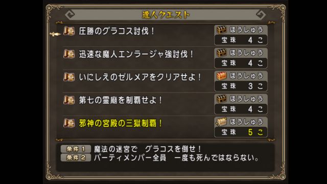 今週宝珠5個もらえるのは、邪神の宮殿三獄制覇!ひとつです。