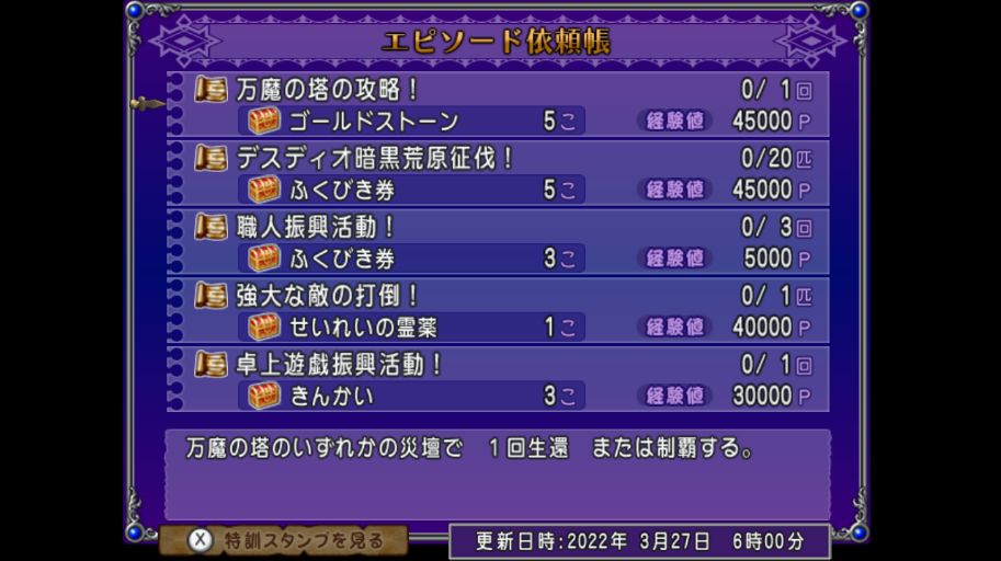 あとは宝珠4個になりますけど、今ロスターのお題にもあるスライムジェネラル討伐!とか、サクッと終わる圧勝の守護者ラズバーン強討伐!もいいかなって思います。