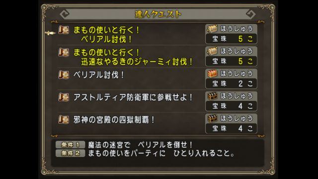 今回宝珠5個のものは、まもの使いと行く!ベリアル討伐!とまもの使いと行く!迅速なやる気のジャーミィ討伐!のふたつ。