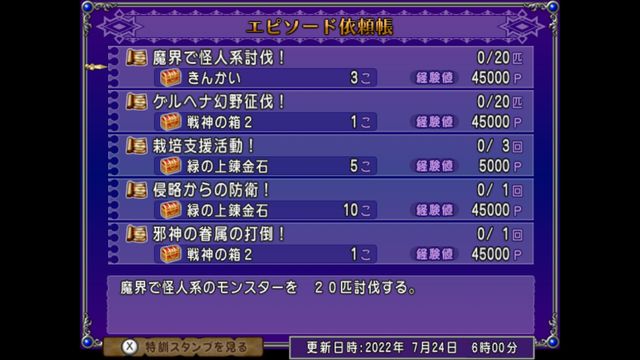 4個になりますけど、大魔王の代筆家と重なるアストルティア防衛軍に参加せよ!とか、明日更新の邪神の宮殿の一獄制覇!も悪くないですね。