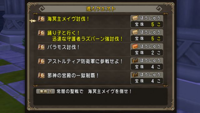 今回宝珠5個のものは、海冥主メイヴ討伐!と踊り子と行く!迅速な守護者ラズバーンの討伐!の2つあります。