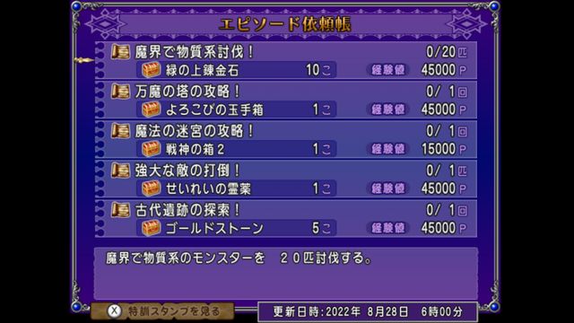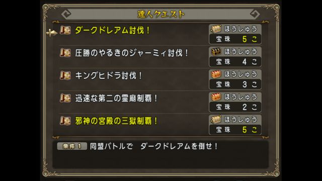 今週宝珠5個のものは、ダークドレアム討伐!と邪神の宮殿の三獄制覇!のふたつ。
