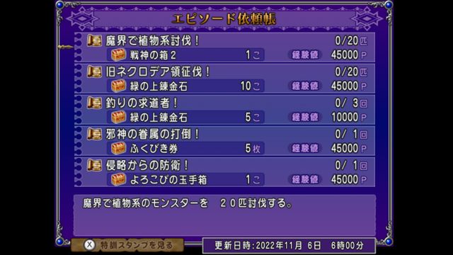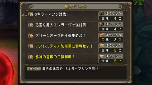 今週宝珠5個のものは、アストルティア防衛軍に参戦せよ!と邪神の宮殿の二獄制覇!のふたつ。