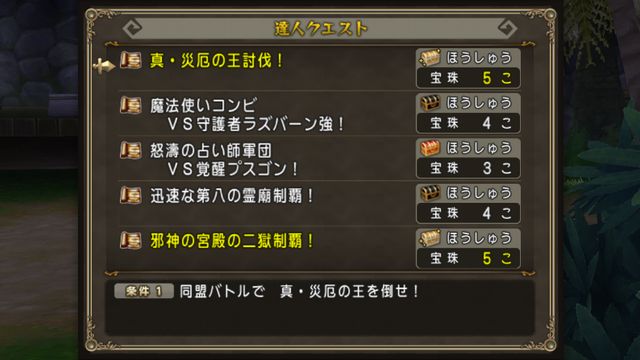 今週宝珠5個もらえるものは、真災厄の王討伐!と邪神の宮殿2獄制覇!のふたつです。