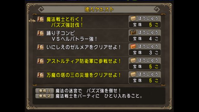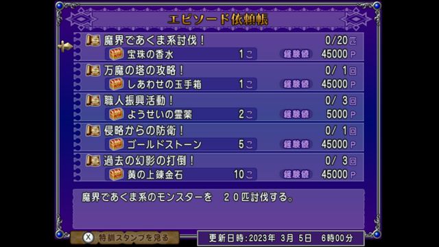 依頼帳のほうに侵略からの防衛!と万魔の塔の攻略!がありますし、アストルティア防衛軍に参戦せよ!と万魔の塔の三の災壇をクリアせよ!のどっちかがおすすめ。