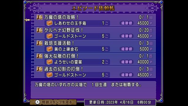強大な敵の打倒!は神話篇最後の敵、過去の幻影の打倒!は強ボス3回討伐になっています。