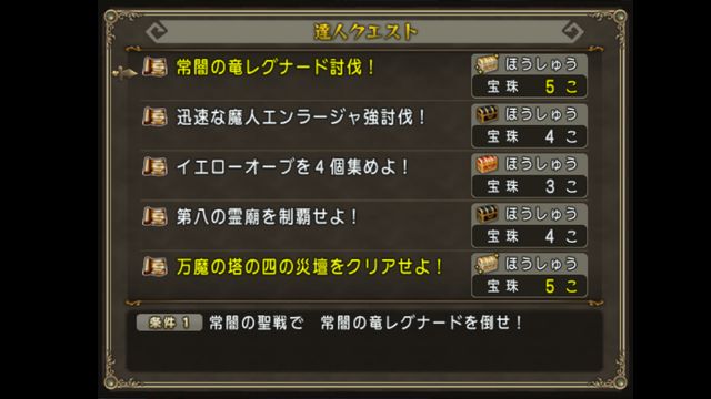 今週宝珠5つのものは、常闇の竜レグナードの討伐!と万魔の塔の四の災壇をクリアせよ!のふたつ。
