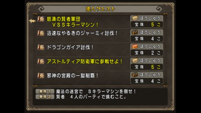 今週宝珠5個のものは、怒涛の賢者軍団VS Sキラーマシン!とアストルティア防衛軍に参戦せよ!のふたつ。