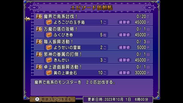 魔界で鳥系討伐!と万魔の塔の攻略!がありますけど、一の災壇のドラキーはじめ一・二・三の災壇に鳥系が出ますので一緒にできますね。