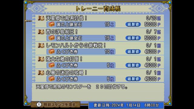 天星郷で鳥系討伐!と西の浮島制圧!があってどっちも黄の上錬金石がもらえますけど、西の浮島には鳥系が出ないのでこっちも一緒にはできません。