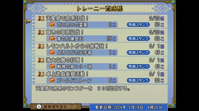 輝きの草原にはにじくじゃくやデスフラッターが出ますので天星郷で鳥系討伐!と輝きの草原征伐!は一緒にできます。