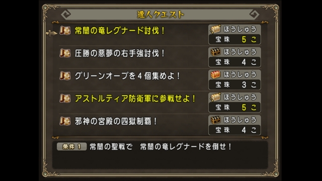 今週宝珠5個のものは常闇の竜レグナード討伐!とアストルティア防衛軍に参戦せよ!のふたつです。