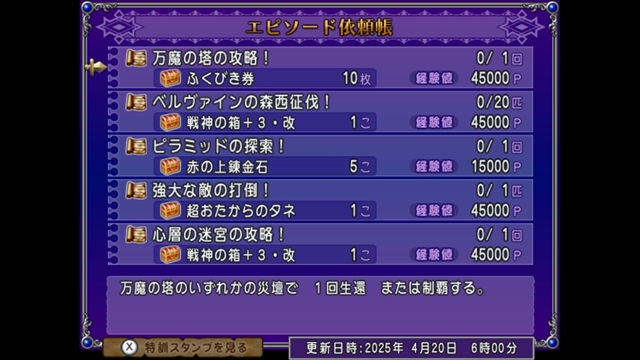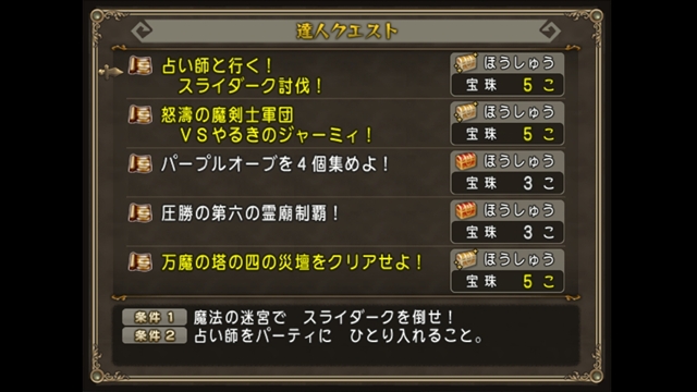 怒涛の魔剣士軍団VSやる気のジャーミィ!なら育成帳と、万魔の塔の四の災壇をクリアせよ!なら依頼帳といっしょにできますね。