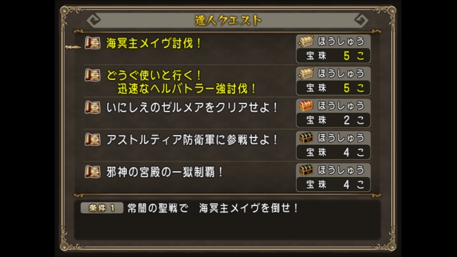 今週宝珠5個のものは海冥主メイヴ討伐!とどうぐ使いと行く!迅速なヘルバトラー強討伐!のふたつになります。