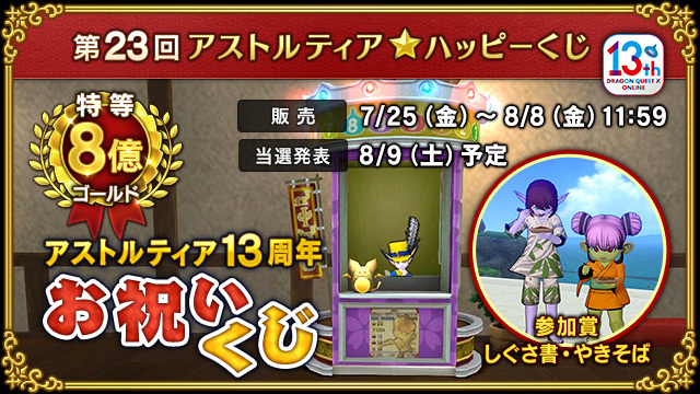第23回アストルティア★ハッピーくじ「アストルティア13周年お祝いくじ」の販売期間が8月8日(金) 11:59までです。