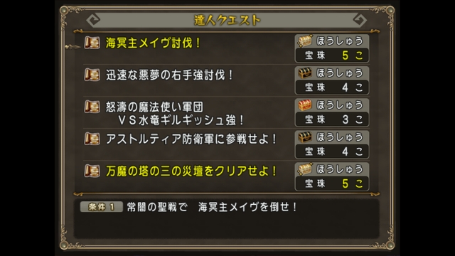 今週宝珠5個のものは海冥主メイヴ討伐!と万魔の塔の三の災壇をクリアせよ!のふたつになります。