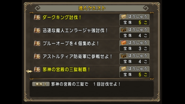 今週宝珠5個のものはダークキング征伐!と邪神の宮殿三獄制覇!(僧侶限定)です。