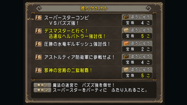 今週宝珠5個のものはデスマスターと行く!迅速なヘルバトラー強討伐!と邪神の宮殿の二獄制覇!のふたつです。