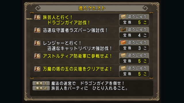 依頼帳に万魔の塔の攻略がありますので、万魔の塔の五の災壇をクリアせよ!なら両方達成できますね。