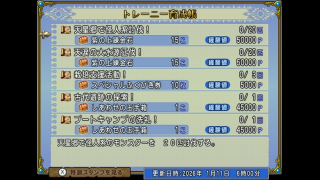 天涙の大水源には怪人系の「グリゴリぼうず」がいますので、天星郷で怪人系討伐!天涙の大水源征伐!は並行してできます。