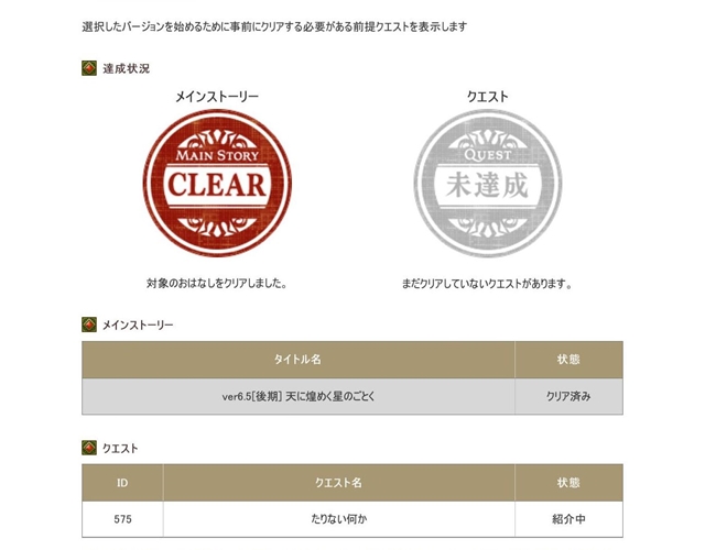 冒険者の広場マイページから見られる前提クエストチェックシートの表示が