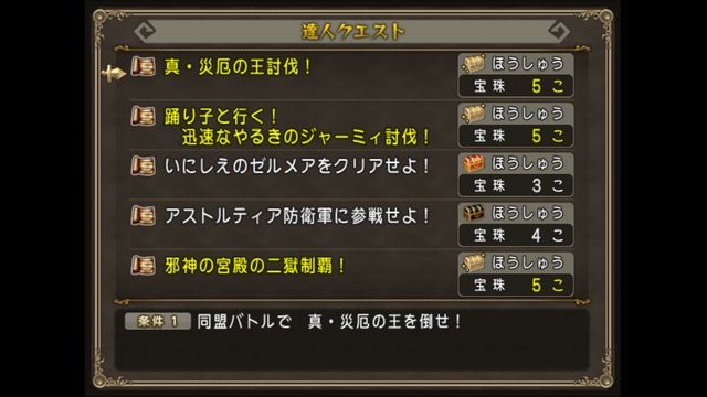 今週宝珠5個のものは3つありますが、踊り子と行く!迅速なやる気のジャーミィ討伐!が一番簡単に終わりそうですね。
