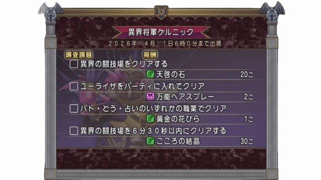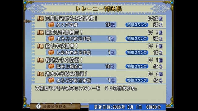 | 魔法戦士で最後まで生存 | 経験値 80,000(特訓スタンプ 100) ふくびき券 ×4 |