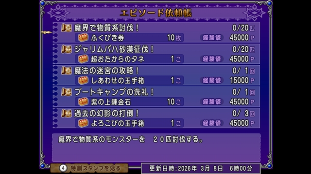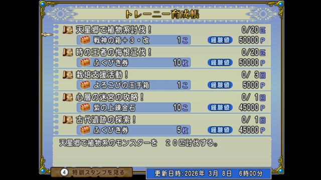 | まもの使いで最後まで生存 | 経験値 80,000(特訓スタンプ 100) ふくびき券 ×4 |