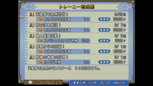 | 天地雷鳴士で最後まで生存 | 経験値 80,000(特訓スタンプ 100) ふくびき券 ×4 |