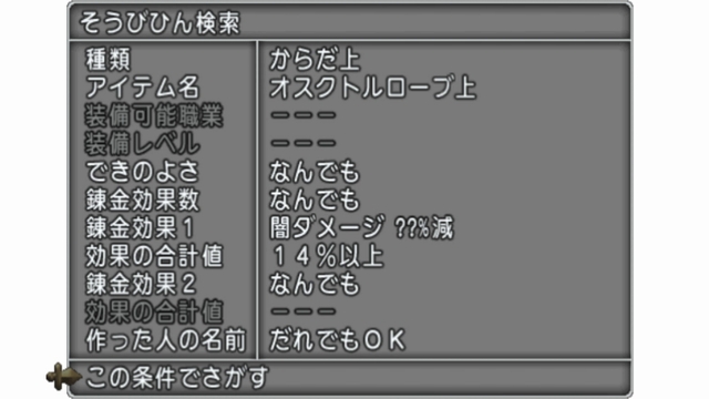 私は賢者中心にヒーラーで参加するつもりですので闇耐性100%にしやすい「オスクトルローブ上」で探してみます。