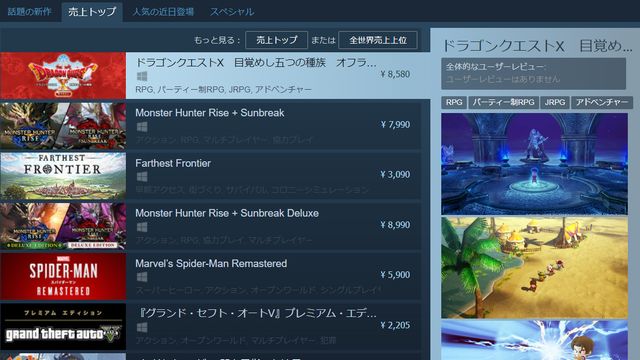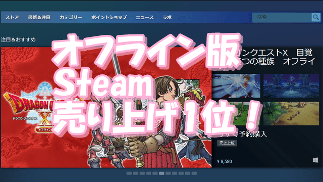 さっきSteamのストア見てたら、ドラクエ10のオフライン版がSteam売り上げ1位になってましたー!