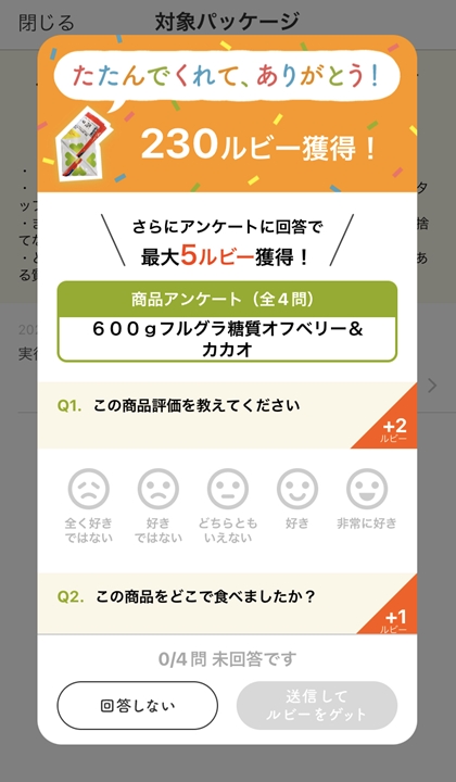 このアンケート回答で+5ルビーもらえますので、かっぱえびせんの77gの30ルビーと合わせて、実質35ルビーです。