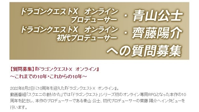 今度ドラクエ10をテーマに、現プロデューサーの青山さんと前プロデューサーの斎藤さんへのインタビューが行われるそうなんですけど、その時の質問を受け付け中なのです。