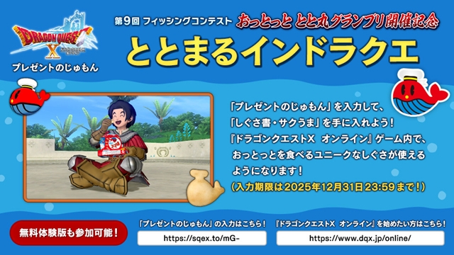 第9回フィッシングコンテスト「おっとっと とと丸グランプリ」で公開されたプレゼントのじゅもんと、大漁祭報酬受け取りが今日12月31日23:59までが期限です。